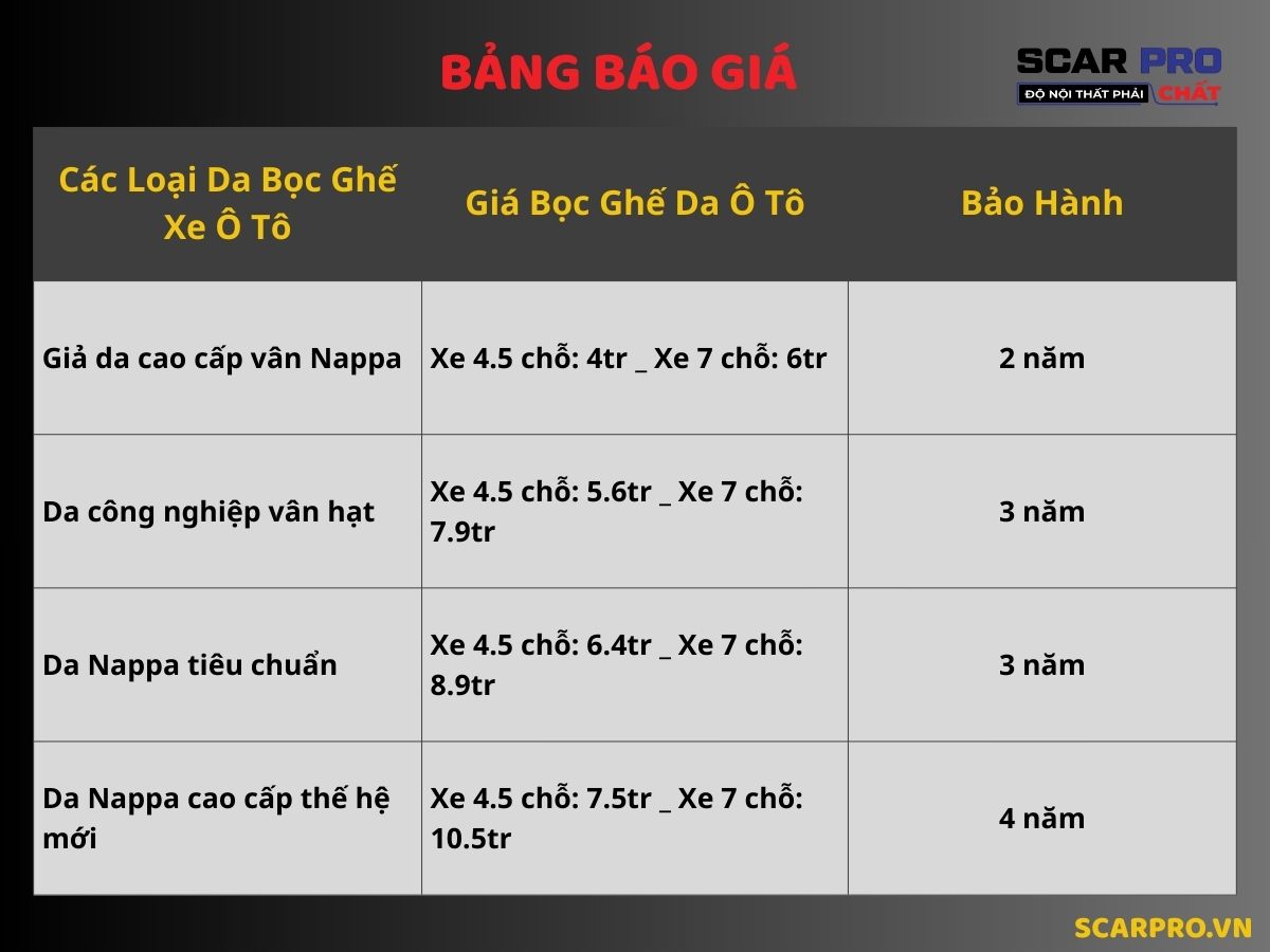 | Giả da cao cấp vân Nappa | Xe 4.5 chỗ: 4tr _ Xe 7 chỗ: 6tr | 2 năm |
